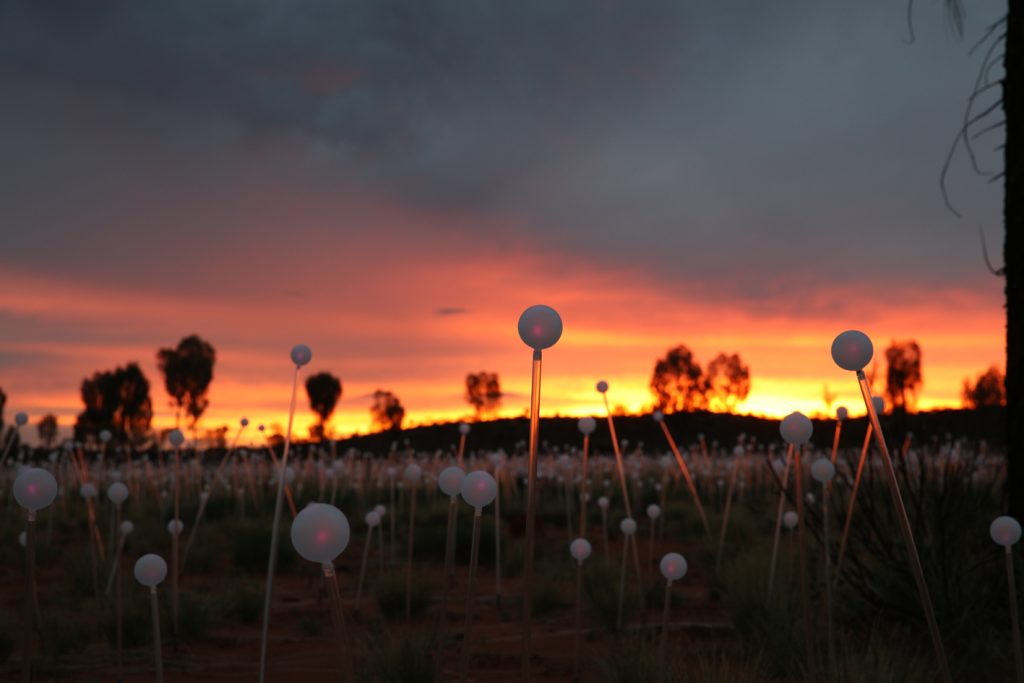 Munro’s first solar powered Field of Light represented a spiritual homecoming for the artist and the artwork which was originally conceived during a visit to Uluru in 1992 with his fiance and now wife, Serena. Field of Light Uluru gently illuminates a remote desert area within sight of the majestic and ancient rock.