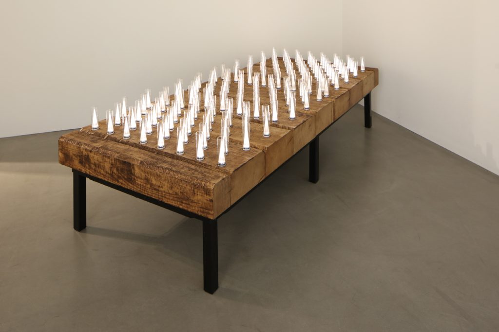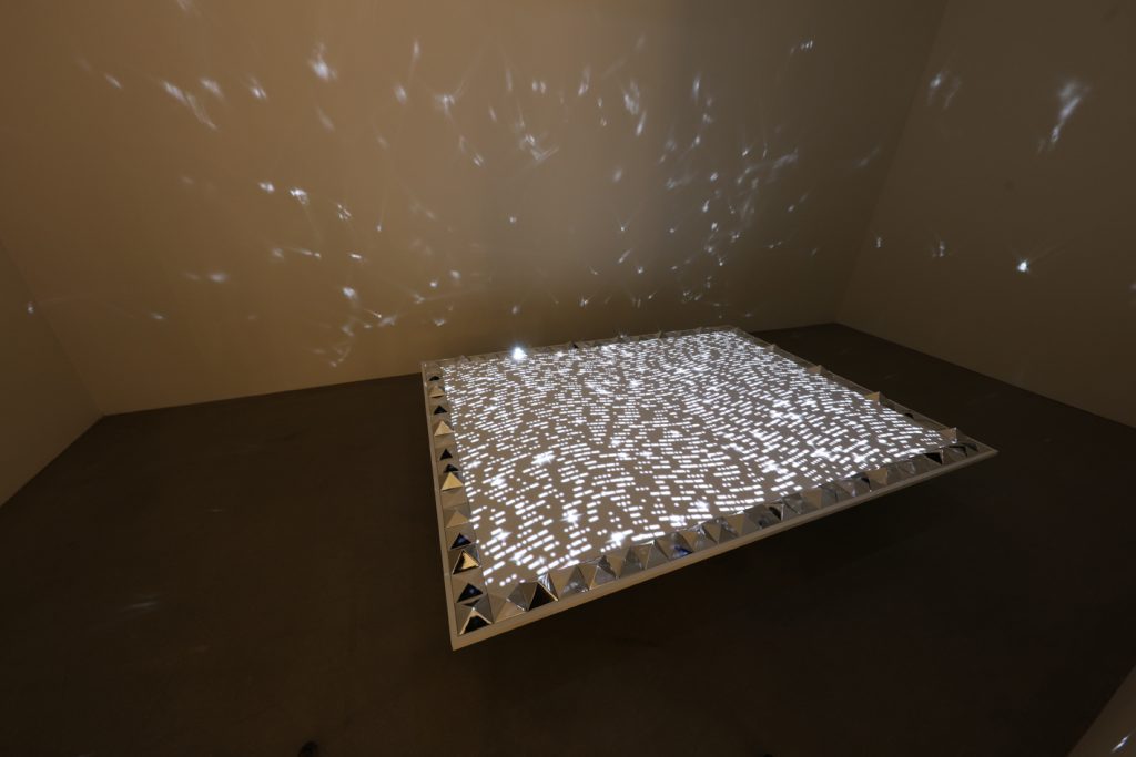 Showing pieces from the artist’s “Light and Language” series, which incorporates language translated into Morse code and light creating animated pattern, the exhibition included “Ferryman’s Crossing II”, a digital-light variation of Munro’s artwork at Scottsdale Museum of Contemporary Art, which continues Munro’s investigation into Hesse’s work as well as two new digital and light animations Cloud and Moonwatcher, Also on display were “Eden Blooms“ a suspended sculptural iteration of Munro’s external exhibition piece of the same name. He also presented “Restless Fakir,” a lyrical reference to Munro’s childhood in England, viewing an exotic world via television.
