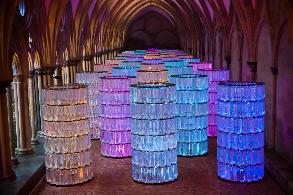 Bruce Munro installed Light Shower and Water Towers in the ancient Salisbury Cathedral in late November 2010.