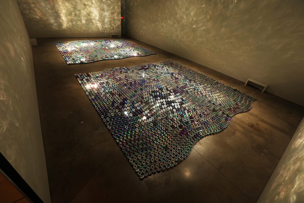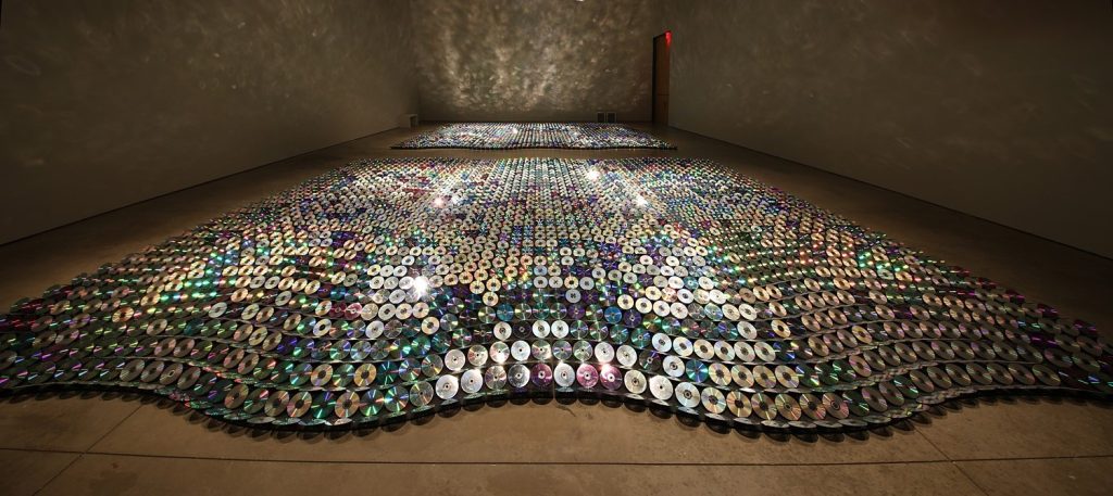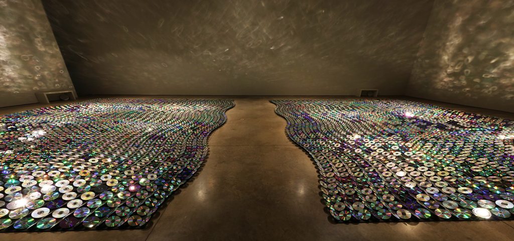 The artwork, with Shimmering rows of reflective compact discs lit by pulses of light, was an installation that evoked sunlight bouncing off the surface of flowing water.